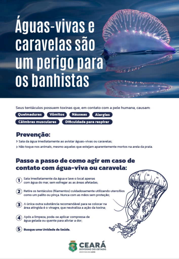 A Saúde do Ceará reforça ainda que as vítimas de acidentes por águas-vivas ou caravelas devem procurar uma Unidade de Saúde, independente da gravidade do caso.