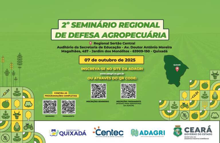 A Agência de Defesa Agropecuária do Estado do Ceará (Adagri) está com inscrições abertas para o II Seminário Regional de Defesa Agropecuária em Quixadá, no Sertão Central. O evento acontece na próxima terça-feira (07), das 08h30 às 17 horas, no Auditório da Secretaria de Educação – Av. Doutor Antônio Moreira Magalhães , 457 – Jardim dos Monólitos. Na quarta-feira (08) acontece também no local um Treinamento para servidores da Adagri.