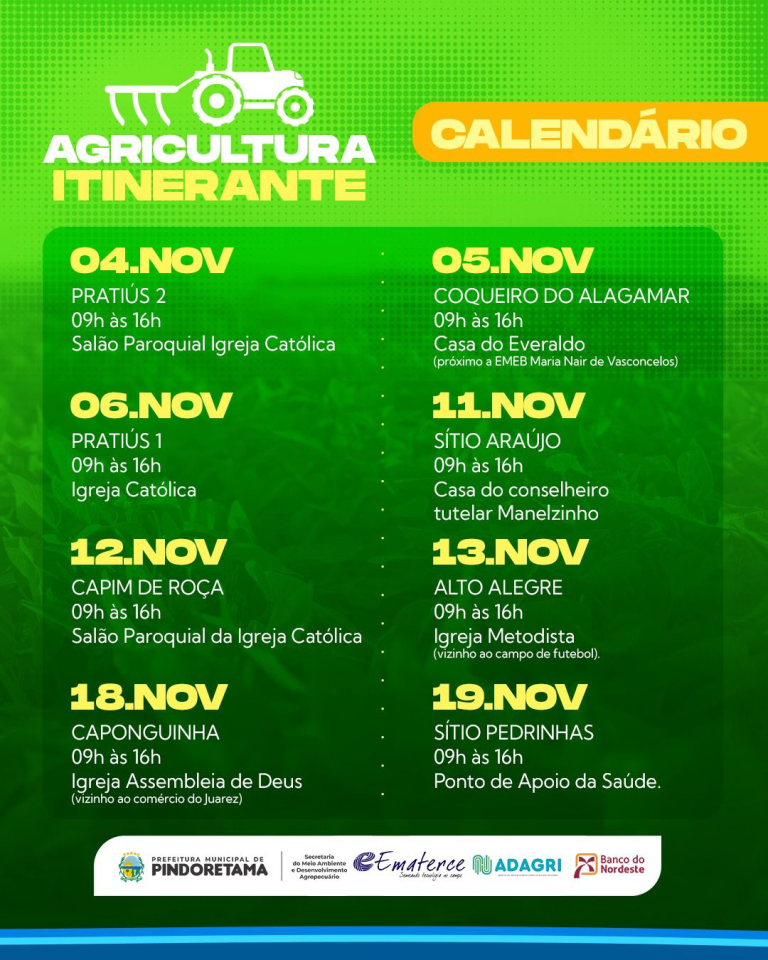 A programação acontece de terça-feira a quinta-feira, nas semanas de 4 a 6, de 11 a 13 e nos dias 18 e 19. O horário é das 9 às 16 horas. Durante a programação, equipes da Secretaria e do Posto realizam inscrições. Eles atendem aos programas Hora de Plantar e Garantia Safra. As equipes fazem também o Cadastro Nacional da Agricultura Familiar (CAF). Além disso, o Posto oferece assistência técnica sobre avicultura.