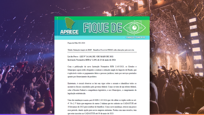 Em publicação enviada aos seus municípios filiados, a Aprece ressalta a importância das gestões municipais estarem atentas às mudanças relacionadas ao Programa Emergencial de Retomada do Setor de Eventos (PERSE). Em mais uma edição de seu Fique de Olho, a entidade repassou informações técnicas e orientações sobre o correto cumprimento das obrigações fiscais dos municípios, frisando que essa é uma responsabilidade que deve ser rigorosamente observada para evitar penalidades futuras.