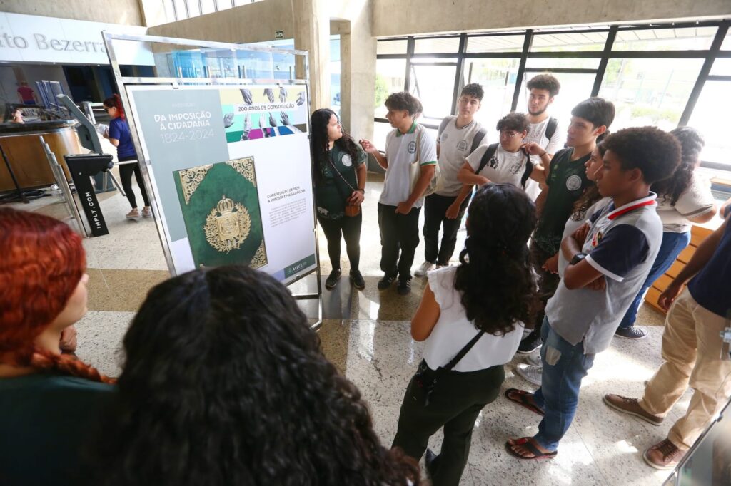 Já no período da tarde, 35 estudantes do 2º ano do ensino médio e do Curso Profissionalizante de Estética da Escola Estadual de Educação Profissional (EEEP) Presidente Roosevelt, do bairro Farias Brito, em Fortaleza, conheceram o acervo do Malce e a exposição temporária “Da Imposição à Cidadania – 1824 a 2024: Dois Séculos de Lutas e de Conquistas”, localizada no hall de entrada do edifício-sede da Alece.