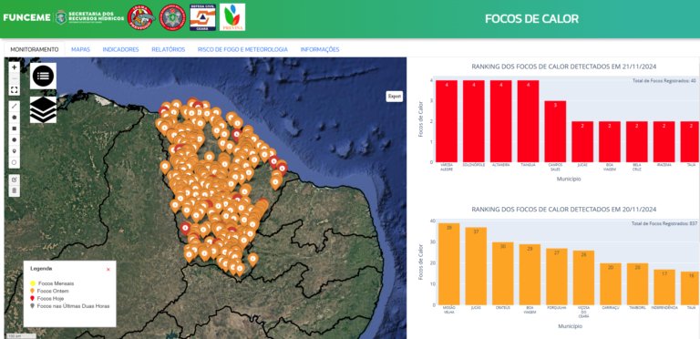 Reforçando seu compromisso com a proteção ambiental e o monitoramento das queimadas irregulares e de incêndios florestais, a Fundação Cearense de Meteorologia e Recursos Hídricos (Funceme) acaba de lançar uma nova plataforma de monitoramento de focos de calor do Estado do Ceará.
