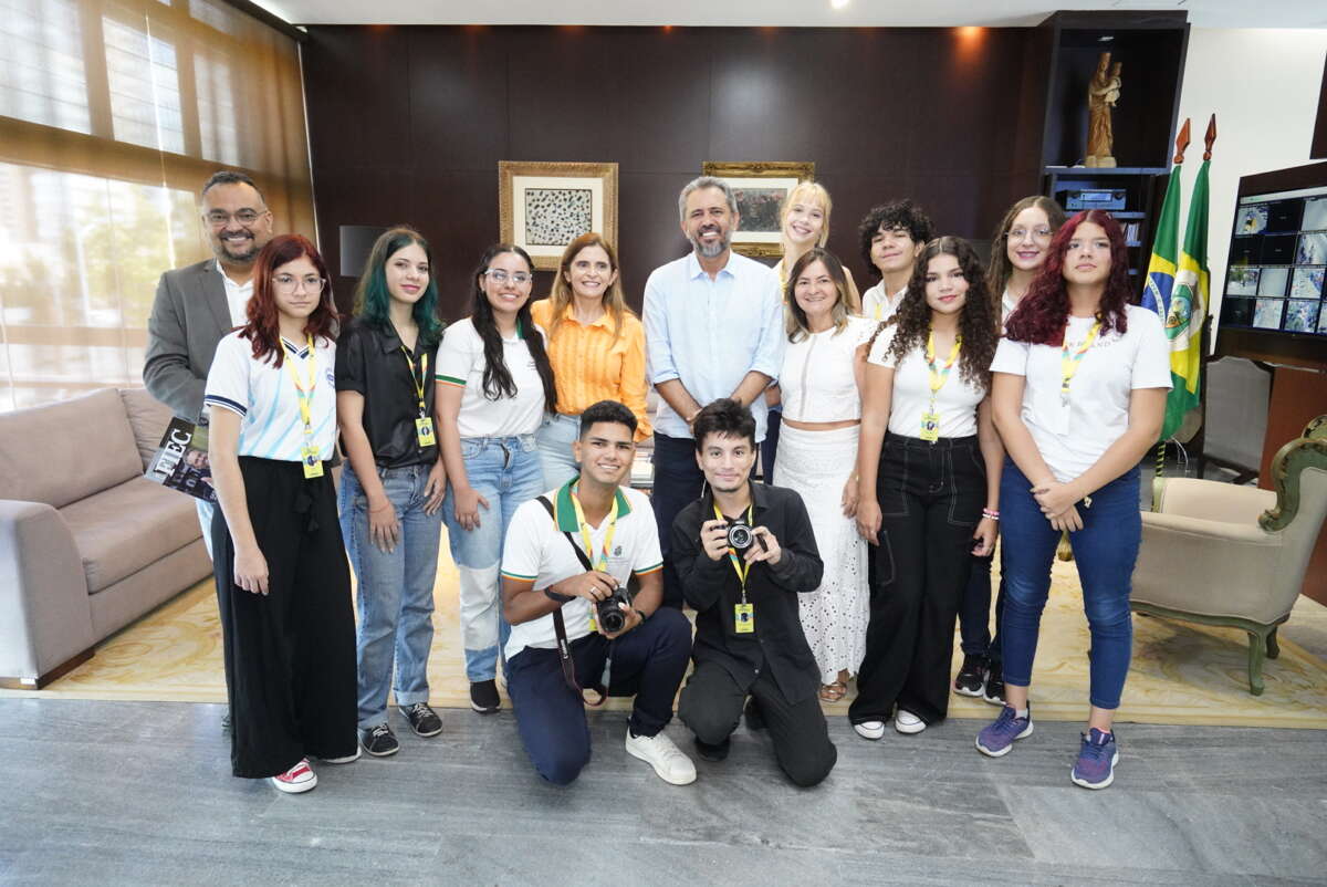 O governador Elmano de Freitas recebeu, nesta quinta-feira (13), no Palácio da Abolição, 14 estudantes que participaram da cobertura da primeira agenda do G20 em Fortaleza. Os jovens, alunos da rede pública estadual, atuaram como repórteres, cinegrafistas e produtores para seguir o evento mundial, sediado no Centro de Eventos do Ceará entre segunda (10) e quarta-feira (12). A secretária da Educação, Eliana Estrela, também participou do encontro.
