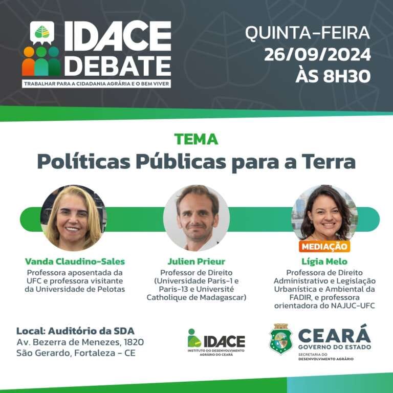 Na quinta-feira, 26 de setembro, às 8h30, acontece mais uma edição do Idace Debate, projeto que mensalmente discute questões relacionadas ao trabalho do Instituto do Desenvolvimento Agrário, uma das autarquias vinculadas à Secretaria do Desenvolvimento Agrário (SDA).