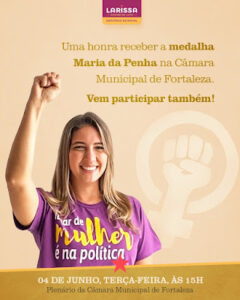 A deputada Larissa Gaspar (PT) será uma das grandes homenageadas durante a solenidade de entrega da Medalha Maria da Penha, na Câmara Municipal de Fortaleza. A parlamentar tem sido destaque no trabalho de combate à violência contra a mulher.