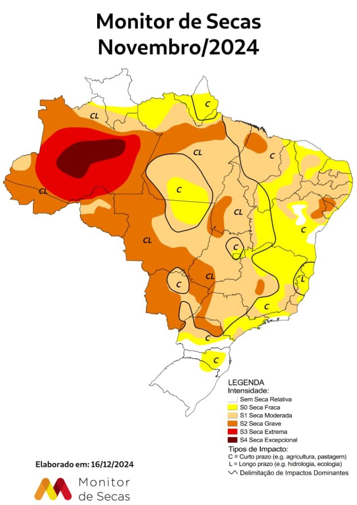 O mapa mais recente do Monitor de Secas, que traz informações sobre o cenário de novembro, indica que o nível de seca moderada avançou sobre o Ceará.