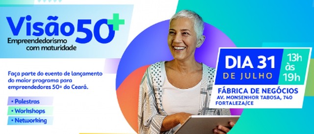 O Sebrae Ceará apresenta o maior programa do Estado para empreendedores acima de 50 anos, o Sebrae Sênior, voltado para empreendedores com mais experiência. O evento gratuito de lançamento, intitulado “Visão 50+: Empreendedorismo com Maturidade”, será realizado no dia 31 de julho, das 13h às 19h, na Fábrica de Negócios em Fortaleza. As inscrições ainda estão abertas através do link.