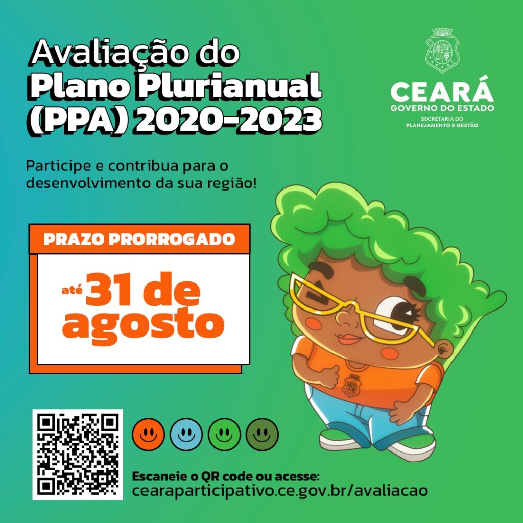 Os cidadãos cearenses terão mais prazo para avaliar as ações realizadas pelo Governo do Ceará no âmbito do Plano Plurianual (PPA) 2020-2023. O período de avaliação, que foi iniciado em 1 º de agosto, foi prorrogado até o dia 31 deste mês. Liderado pela Secretaria do Planejamento e Gestão do Ceará (Seplag-CE), o processo de avaliação do PPA 2020-2023 é fundamental para enriquecer o debate sobre os resultados da ação de governo e sobre a definição de prioridades, além de contribuir para que a sociedade se sinta corresponsável pela gestão dos programas e projetos governamentais.