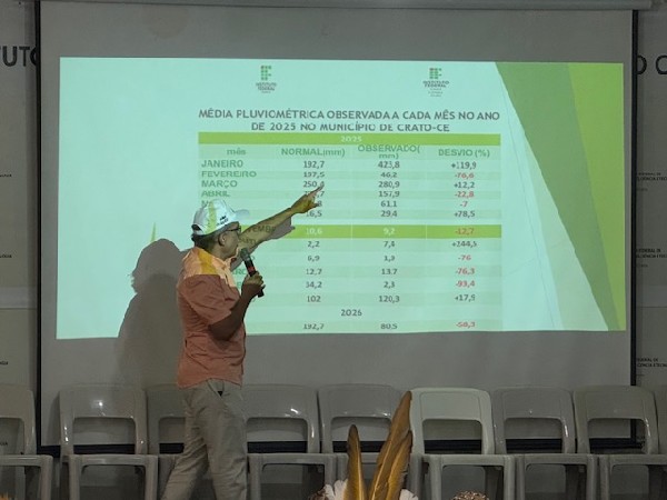 O professor do IFCE, Danusio Sousa, fez uma breve apresentação dos índices relacionados às chuvas no ano passado, e as perspectivas para esse ano, conforme a meteorologia. Segundo ele, o fenômeno El Nino pode vir mais forte nos próximos meses provocando a redução das chuvas. “A gente espera que esse ano o agricultor consiga uma produção maior”, diz.