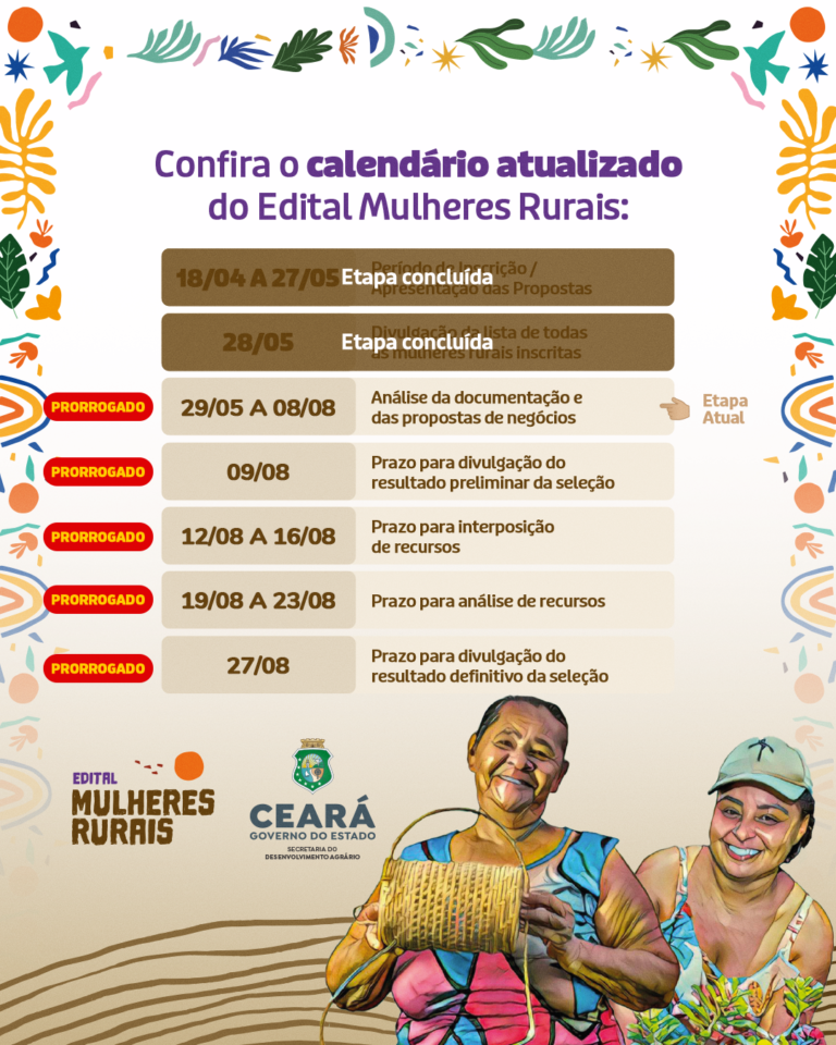 A extensão de prazo se dará por dez dias devido ao elevado número de mulheres rurais inscritas. Diante da extensão de prazo, o resultado preliminar das propostas de negócios selecionadas será divulgado no próximo dia 9 de agosto, conforme novo calendário do Edital de Chamada Pública n.º 01/2024.