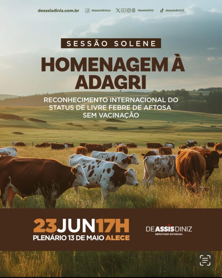 A Assembleia Legislativa do Ceará realizará, na próxima segunda-feira (23), uma Sessão Solene em homenagem à ADAGRI (Agência de Defesa Agropecuária do Estado), por sua contribuição para que o Ceará fosse reconhecido internacionalmente como território livre da febre aftosa sem vacinação. A solenidade foi proposta pelo deputado estadual De Assis Diniz (PT), atual 1º Secretário da Casa.